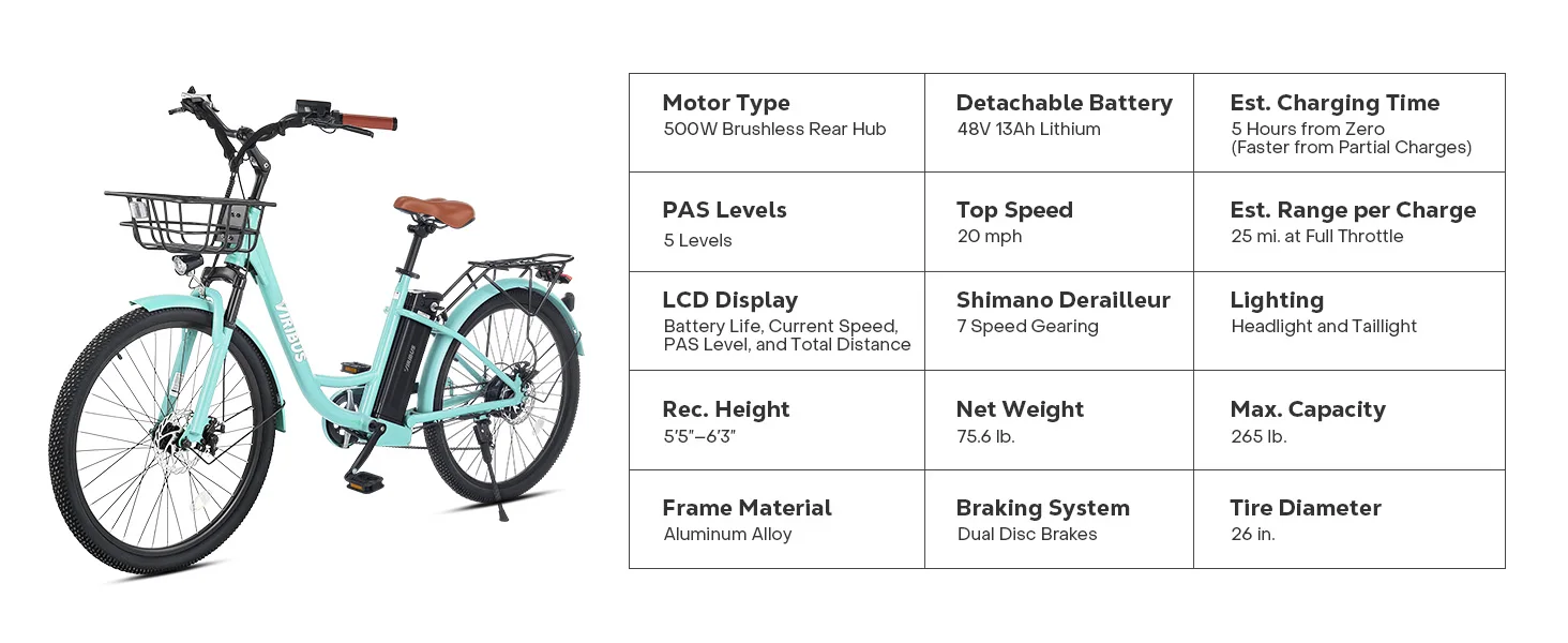 Get ready to revolutionize your daily routine with Viribus's adult electric bike! This 26 inch ebike features a powerful 48V battery that delivers a pedal assisted range of 45 miles and a full throttle range of 25 miles, making it an ideal solution for daily commuting, grocery shopping, and leisurely weekend rides.